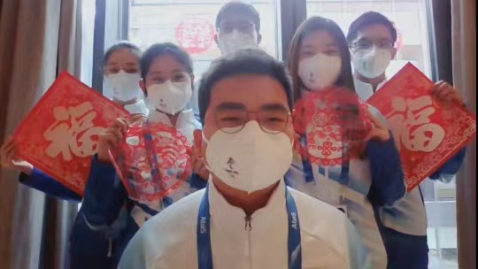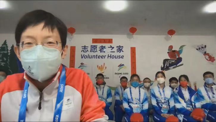 延庆冬奥村志愿者经理邓听介绍了冬奥村开村以来,志愿者上岗服务、疫情防控、团建激励工作的开展情况,并现场连线在岗志愿者代表,大家纷纷通过视频传递新春祝福。