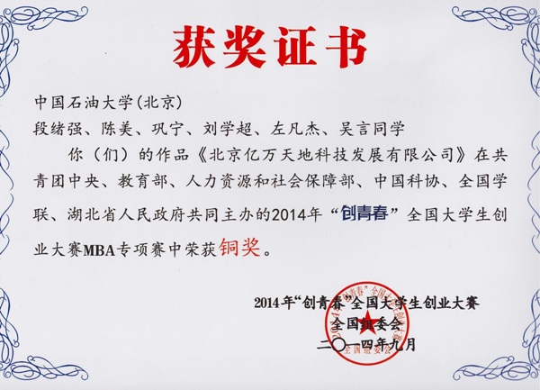 9月26日,由共青团中央、教育部、人力资源和社会保障部、中国科协、全国学联、湖北省人民政府联合主办的2014年“创青春”全国大学生创业大赛MBA专项赛终审决赛闭幕式在湖北襄阳举行。共青团中央书记处书记傅振邦,中国科协、全国学联、共青团湖北省委、湖北省科协等部门相关负责人,新东方联合创始人王强等专家评委和来自全国101所高校的500多名参赛队员出席闭幕式。本次大赛是“挑战杯”创业大赛改制以来举办的首届MBA专项赛,共吸引了全国设有MBA专业的237所高校参与,最终评出金奖16项、银奖32项和铜奖52项。石大工商管理学院2013级MBA专业学生团队的“北京亿万天地科技发展有限公司”项目最终获得铜奖。