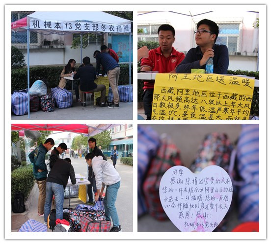 10月18日至22日,为践行社会主义核心价值观,建设服务型党支部,深化学生党员为人民服务的意识,石大机械与储运工程学院本科2013党支部开展了主题为“为阿里地区送温暖”的爱心捐赠活动,共收到捐赠物品29大袋。