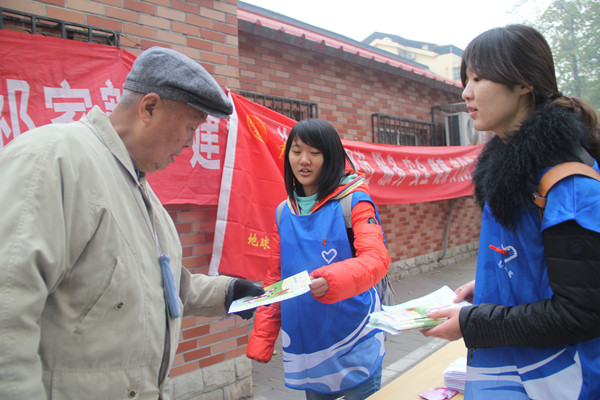 为纪念12•1世界艾滋病日,加强社区居民对艾滋病的了解,提高艾滋病的防控意识,11月29日,石大地球科学学院(本)2013-2014联合党支部成员们走进朝阳区亚运村街道祁家豁子社区开展志愿服务交流活动。