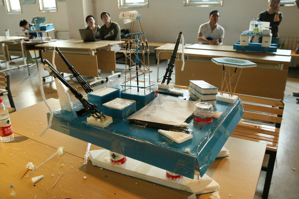 本次比赛分为初赛和决赛两个阶段。初赛于25日下午举行,选手们根据设计书在规定的时间内,用给定的材料进行了钻井平台模型制作,经过严格的筛选,共选出9支队伍进入决赛。