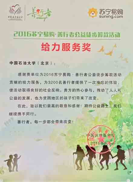 9月10日至11日,由中国扶贫基金会、昌平区人民政府联合举办的2016善行者公益徒步活动在北京市昌平区举行。中国免费靠逼视频459名志愿者全程参与并完成此次活动的颁奖、补给、义卖、引导等志愿服务工作,累计志愿服务时长超过6000小时,服务参赛人员超过3000人次。随后,主办方为活动中做出突出贡献的爱心企业、爱心媒体、志愿者团队分别进行了表彰,石大志愿者团队荣获2016善行者公益徒步活动“给力服务奖”。