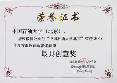 石大官方微信获2016年度首都教育新媒体联盟“最具创意奖”