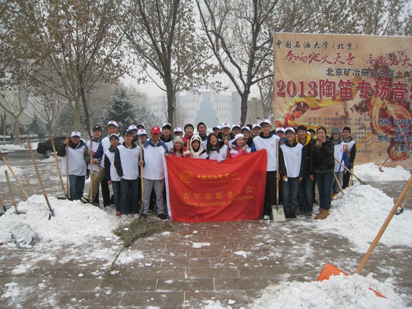 12月14日,石大青年志愿者协会组织45名志愿者进行校园义务扫雪活动。志愿者们借来雪铲,铁锹、扫帚等工具,冒着严寒,顶着大雪,到学校各处进行义务扫雪。志愿者们热情高涨,路过的学生受到感染也加入到扫雪工作当中。经过大家一个多小时的不懈努力,志愿者们清扫了学校图书馆、南广场周边的积雪,得到了全校师生的赞扬。