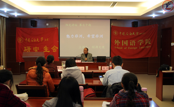 程涛还展示了他在非洲工作和生活的照片,并与现场学生进行了互动交流。讲座生动丰富的内容,使同学们对非洲的自然环境、经济发展、历史文化和中非关系有了更加全面深入的认识和了解。本次活动由校党委主办,校团委、外国语学院联合承办,校研究生会协办。