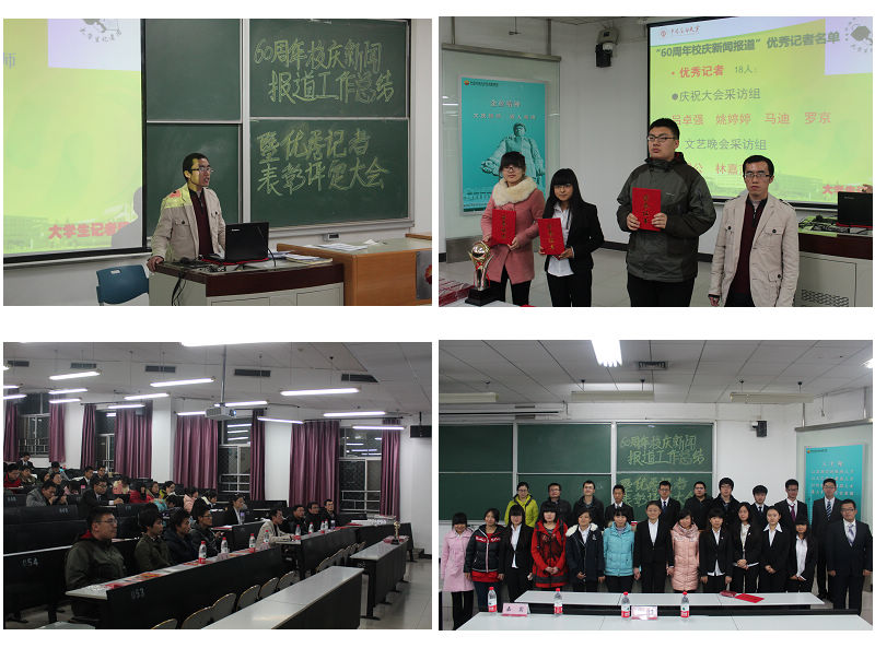 11月22日晚,大学生记者团在三教106举行60周年校庆新闻报道工作总结暨优秀记者表彰会。党委宣传部刘志庆、团委新闻中心主席罗丛山及其他新闻类社团代表、60周年校庆新闻报道小组的成员们参加了表彰会。