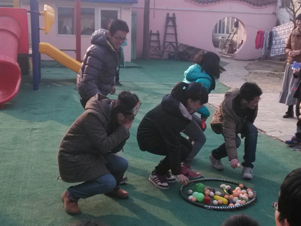 活动中,志愿者和智障儿童一起玩红路灯、丢手绢儿等游戏,引导他们进行沟通,聊聊“家常”,写写汉字,并教授他们一些生活常识。