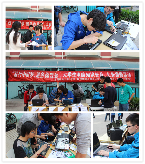 4月9日,石大地球物理与信息工程学院计算机本2011党支部充分发挥专业特色,将理论与实践有机结合,积极建设服务型基层党支部,在润杰公寓东门设立志愿服务站点,开展“践行中国梦,服务你我他”大学生电脑知识普及、义务维修活动,为广大学生提供便利。