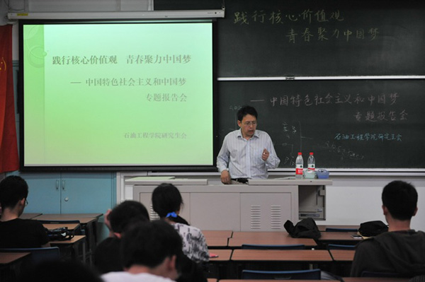 4月14日,石大石油工程学院以“践行核心价值观,青春聚力中国梦”为主题的教育实践活动之“中国特色社会主义和中国梦”专题报告会在一教208教室举行,邀请到了马克思主义学院教师吕文江作为嘉宾。