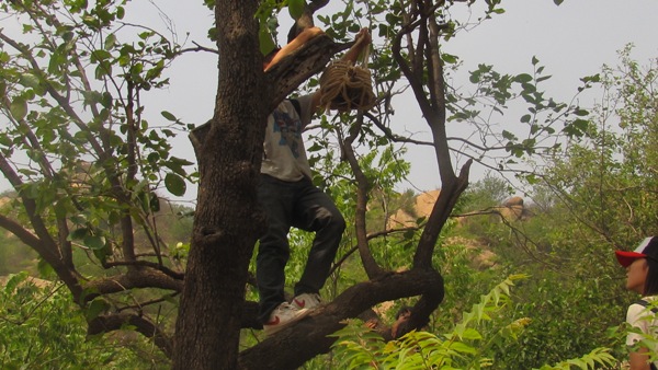 在到达风景区后,志愿者寻找高大隐蔽的树木,在保障安全的前提下爬上树枝,用铁丝将志愿者所做的6个人工鸟巢一一安放固定在树上。