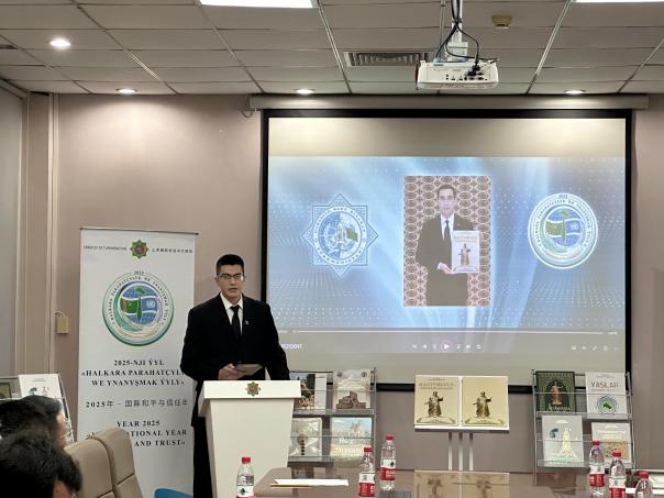 土库曼斯坦驻华大使帕拉哈特·杜尔德耶夫在致辞中强调,2024年是土库曼斯坦诗人、思想家马赫图姆库里诞辰300周年,国际社会与土库曼斯坦为此举办了系列纪念活动。谢尔达尔·别尔德穆哈梅多夫总统的新书《马赫图姆库里——世界的思想家》不仅是对马赫图姆库里哲学理念与诗歌艺术的系统梳理,也是对联合国“2025国际和平与信任年”倡议的积极响应。马赫图姆库里的和平与友谊精神与土库曼斯坦中立30周年的外交理念相契合,留学生应成为两国文化交流的桥梁,让思想之光照亮合作之路。