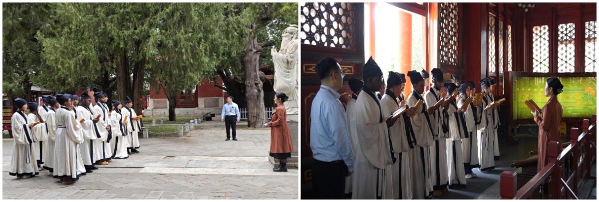 中石大对外汉语名师与孔庙和国子监博物馆专家为来华留学生实地讲授“中国传统儒家文化大课”。在孔庙大成殿前,来华留学生在博物馆研究员陆承指导下,身着明代祭孔礼服行四拜礼,感受中国尊师重教传统;在进士题名碑林与十三经碑林实地调研学习198通石碑、63万字石经的文化背景,系统了解了科举制度演变及拓印技艺对文化传播的推动作用;在辟雍大殿齐诵《礼记·礼运篇》经典篇章,结合本国文化解读“天下为公”的当代价值。