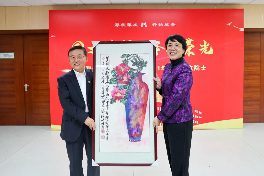 学校90多岁高龄的华泽澎教授得悉四位校友当选院士的喜讯后也非常高兴,并和余世诚教授分别提笔泼墨,为四位院士题字作画。陈峰、吴小林向新晋院士们赠送了书画作品。