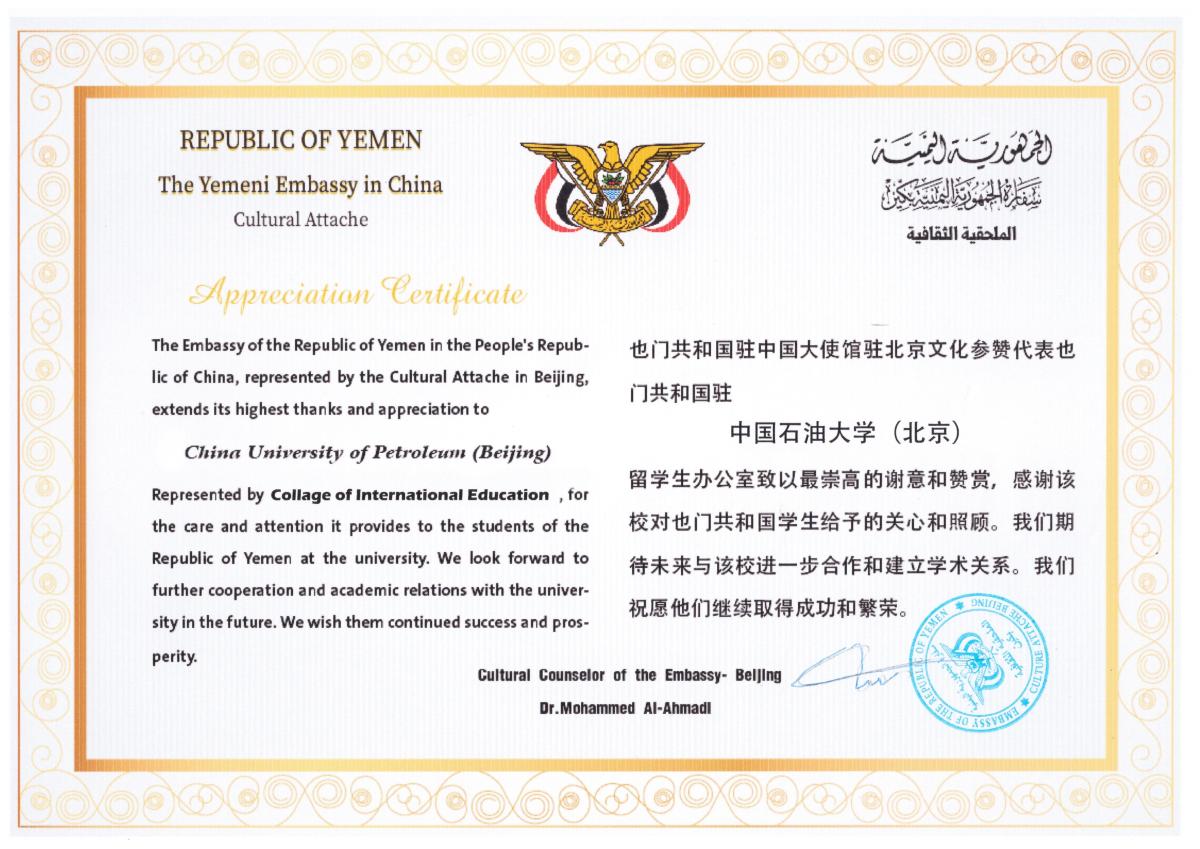 Dr. Mohammed Al-Ahmadi一行向学校颁发感谢函,并为使馆评选的2024年优秀也门籍国际研究生颁发荣誉证书。Dr. Mohammed Al-Ahmadi感谢了学校的接待,回顾了也门驻华使馆文化处与学校的交流合作情况,他表示,希望通过此次访问进一步加强与学校交流合作,推动也门教育部门与学校在来华留学教育以及教学科研等多个层面深化沟通与合作。