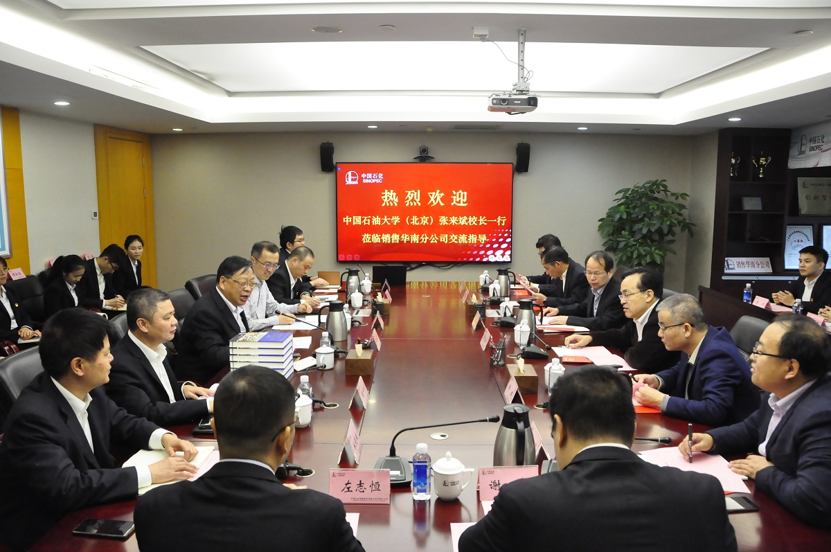 在中国石化销售有限公司华南分公司,总经理田中山,副总经理刘胜、赖少川接待了张来斌一行。田中山欢迎张来斌一行来访,他指出,华南销售正在加紧智慧管网建设,迫切需要与中石大加强合作交流,双方应不断拓展合作内容,加强多学科交叉融合研发,落实好学生实习实践基地。张来斌感谢华南销售多年来对学校的关心和支持,他表示,华南销售近年来快速发展,校企双方合作效果显著,希望双方秉承开放理念,不断创新合作方式,拓展合作内容,打造产学研合作品牌项目,联合培养优秀人才。