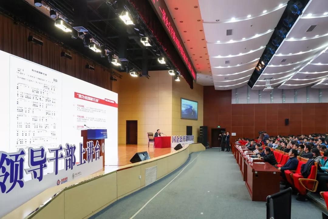 汪东进讲述了渤海油田的发展历史和“海上铁人”郝振山的先进事迹,讲述了中国海油传承“苦干实干”“三老四严”的石油精神,在浩瀚海洋上开发蓝色国土的生动实践。