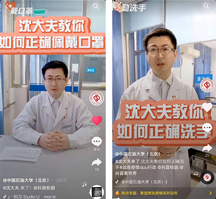 为做好新型冠状病毒感染的肺炎疫情防控工作,提高全校师生员工的自我防护意识,近日,中石大官方抖音推出了防控疫情短视频《我承诺》、《同心战“疫” 共迎春光至》等,校医院院长沈晓峰开通了“#沈大夫来了”专栏,目前发布了4期短视频,内容包括如何做好自我防护、外出注意事项等。