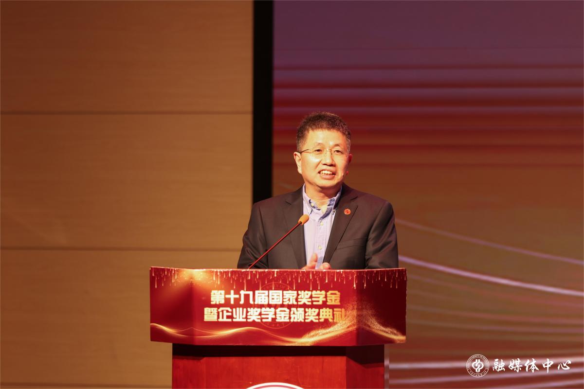 蒲俊霖为国家奖学金、国家励志奖学金学生代表颁奖,设奖单位嘉宾为企业奖学金学生代表颁奖,获奖学生为设奖企业献上感谢信。