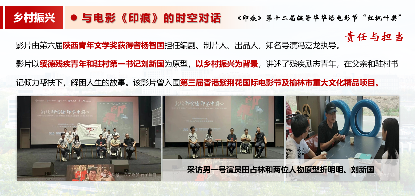 实践团观看了榆林市重大文化精品项目、第十二届温哥华华语电影节(2024)“红枫叶奖”《印痕》,影片以绥德残疾青年和驻村第一书记刘新国为原型,以乡村振兴为背景,讲述了残疾励志青年,在父亲和驻村书记的帮扶下,不畏困难、成就人生的故事。