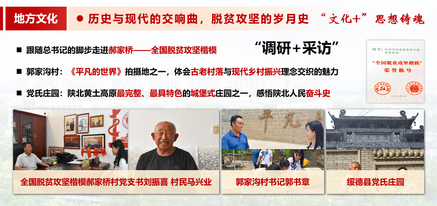 团队以红色文化、非遗文化、能源文化、地方文化为主线,通过走访红色基地、了解非遗文化、调研能源企事业单位,感受能源企业建设。在全国脱贫攻坚“农村楷模”——郝家桥,感悟乡村振兴发展,在《平凡的世界》拍摄地郭家沟感受历史变迁,在黄土高原党氏庄园感悟陕北人民的奋斗历程,在南沙桥镇索厂村了解农旅融合新模式,在南华野生菌市场传承菌文化。团队联合南华文旅、绥德文旅等媒体平台开展直播,累计浏览量10余万。实践团队深入社区、学校、乡村开展文化宣讲,覆盖群体达300余人。