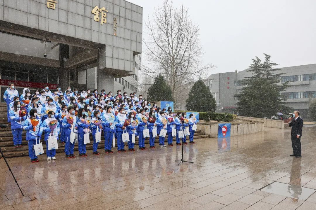 陈峰向归来的志愿者表示亲切问候,他说,在这堂冰雪上的“大思政课”中,中石大志愿者践行了“请党放心,冬奥有我”的铮铮誓言,是“最有执行力、最有战斗力、最有爱国情、最有荣校志”的中石大青年代表。他表示,同学们生逢其时,能够服务冬奥会、冬残奥会很幸运,希望同学们带着这份收获和荣耀,在未来的人生道路上谱写更多精彩华章。