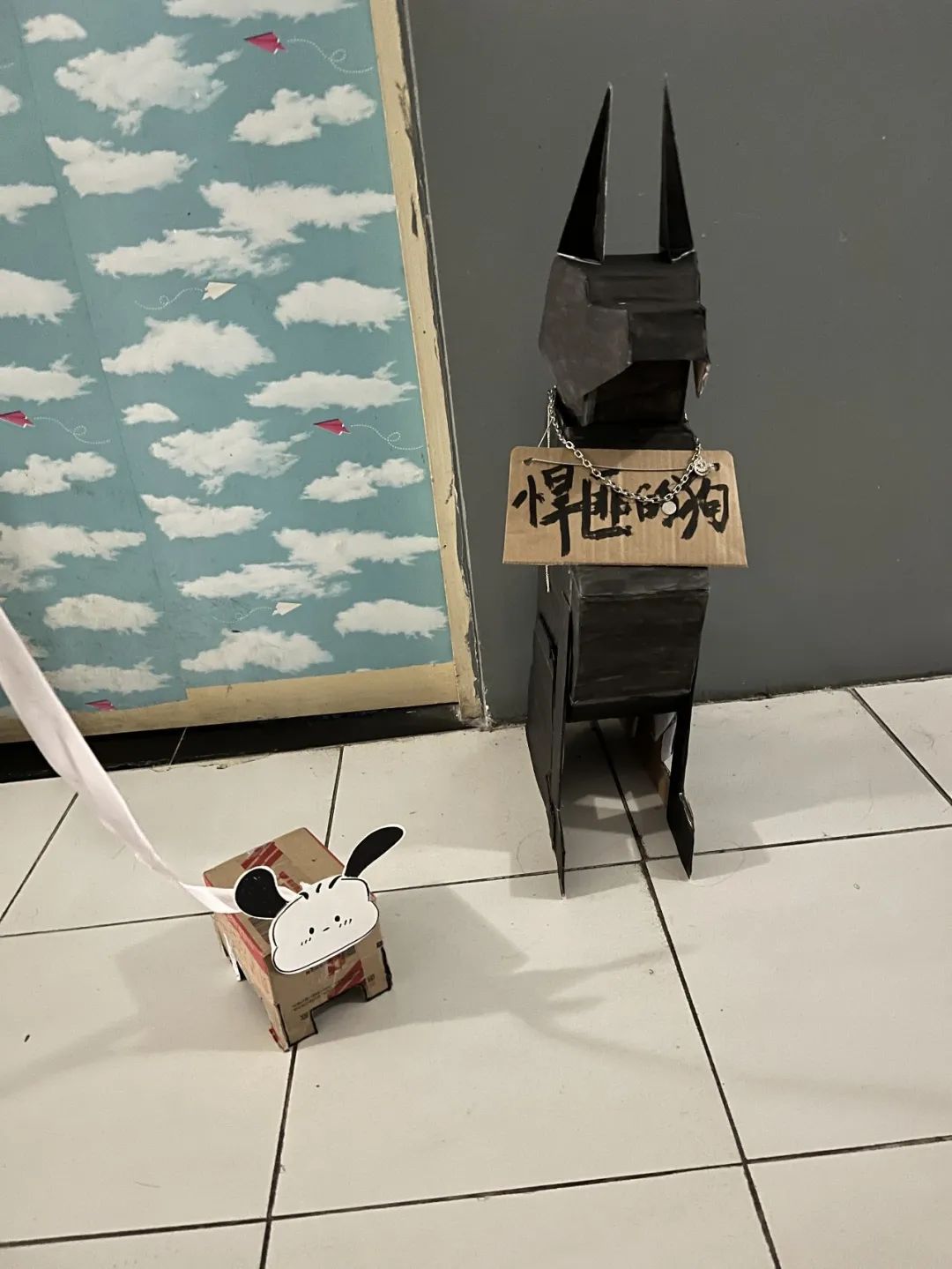 最近学生宿舍还流行养“狗”了,用纸盒自制的悍狗或萌犬,各种可爱扮相的狗狗们,纷纷在宿舍门口高调亮相,一副“兄弟们,我来帮你赶走病毒吧!”的架势。