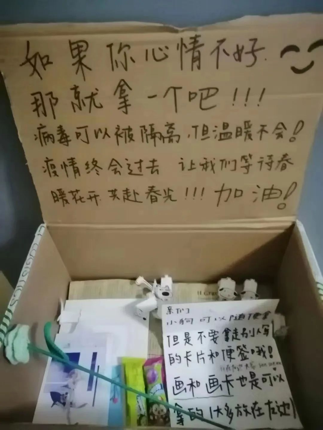王天阳说,自己也是受另一位小姐姐的启发,才想到用爱心盒子的方式给大家打气,“病毒可以被隔离,但温暖不会!”