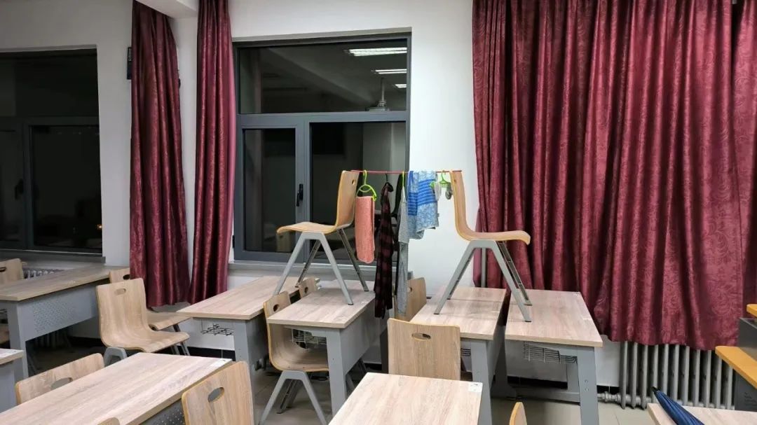 教室一角,一张窄窄的折叠床,两张椅子中间拉一条线就是挂衣架,颇有点石油大会战的味道。