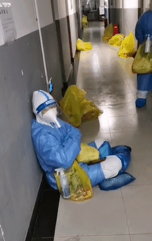 还有些志愿者协同校医院医务人员,连续为师生开展核酸检测,经常是任务一完成就瘫坐在地上,他们是真的累了。