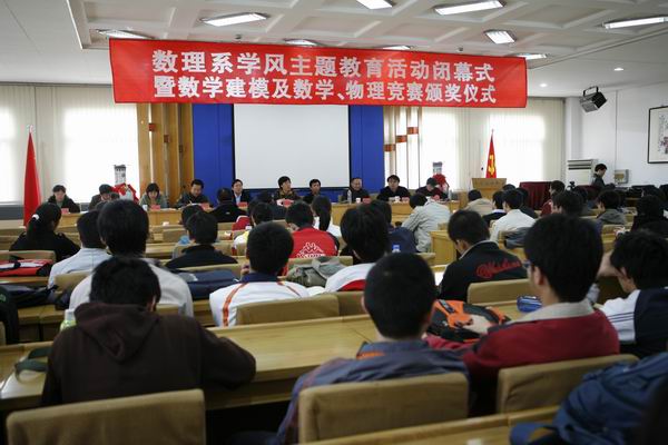 大会由数理系主任梁景伟主持。数理系党总支书记孙为介绍了此次活动的开展情况,总结了应用数学专业开办以来的经验和教训以及在探索建立学风建设的长效机制方面取得的初步成效。徐春明副校长宣读了美国数学建模竞赛、全国数学建模竞赛、全国物理竞赛获奖同学名单。