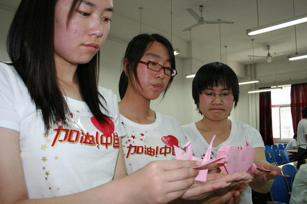 同学们先通过一部记录短片再现了地震中一幕幕触动人心的画面,在场的每一个人都无比悲痛。在庄严的默哀之后,在场的同学们用真情和泪水与大家分享了这几天自己心中隐藏的最令人感动的事迹。一首以《我们和你在一起》的诗歌朗诵道出了此时此刻每一个中国人的心声。为了表达同学们对灾区同胞的关心和帮助,同学们除了为灾区同胞们捐款,这一天还为灾区的学生和孩子们捐赠的价值一千余元的各类学习用具,希望他们可以早日重返课堂。与此同时,每一名同学还为灾区的同胞和所有前去救灾的武警官兵和志愿者们折了一只千纸鹤,写上自己心中最想说的一句话,并制作了“四川挺住,中国加油”的条幅,以寄托大家的祝福。