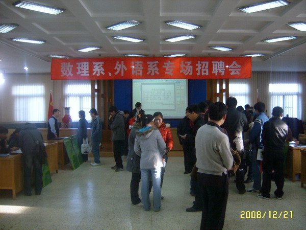 12月21日上午,在就业指导中心的大力支持下,数理系、外语系联合在第四会议室举行了专场招聘会。参加此次招聘会的单位有北京雅丹石油技术开发有限公司、昌平卫校等企事业单位共10家,涵盖了数学、英语、计算机、石油地质、机电等十余个需求专业。前来咨询应聘的不仅有数学和英语专业的学生,还有计算机、人文、工商、电子等专业的部分学生。