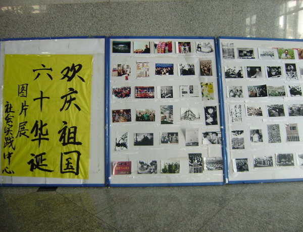 本次图案片展活动以祖国发展60年时间为主轴,在60年中每年选取一张能够代表当年祖国发展的代表性照片进行展览,共展览照片60张。展览设在三教大厅北侧,展览时间为9月29日至10月3日。同时,社会实践中心在北校区小广场悬挂了“祖国母亲六十寿,中华儿女悠悠情”条幅。