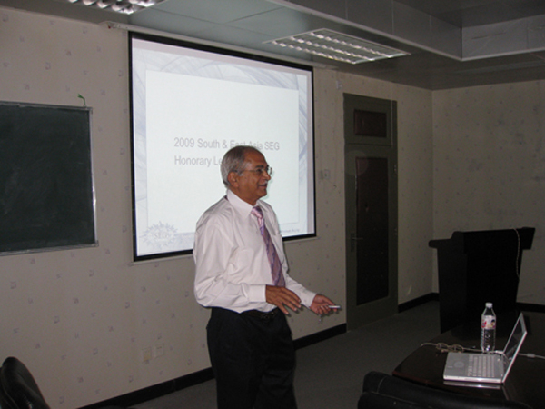 10月15日下午,2009年度美国勘探地球物理家学会(SEG)东南亚杰出巡回演讲应邀在科研综合楼1103会议室举行,演讲人为C.H.Mehta博士,演讲题目为“Significance of Fresnel zones in seismic reflection prospecting”。本次报告会是巡回演讲的第三站。