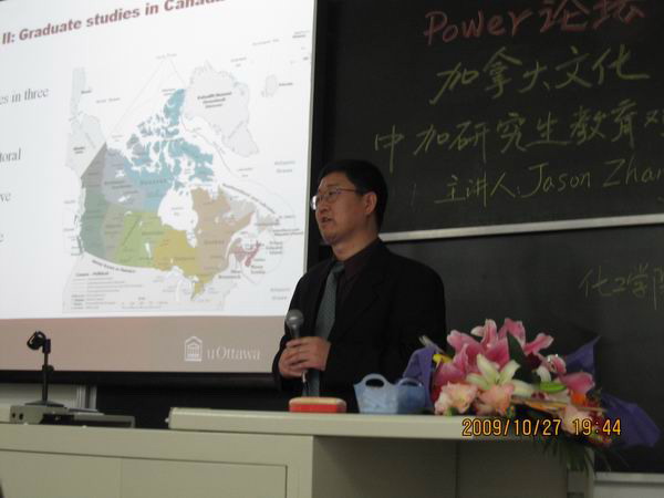 Jason Zhang教授以自己在加拿大生活工作十几年的经历,用诙谐独特的语言,讲述了加拿大的风土人情、经济状况、主要城市、城区分布以及人口年龄结构等一些现状,给同学们开阔了视野,拓展了思路。尤其在讲到中加研究生教育的时候,Jason Zhang教授对加拿大研究生教育结构体系做了形象的讲解,并以化学工程专业为例子对加拿大的各知名大学师资力量做了对照,引起了同学们浓厚的兴趣。