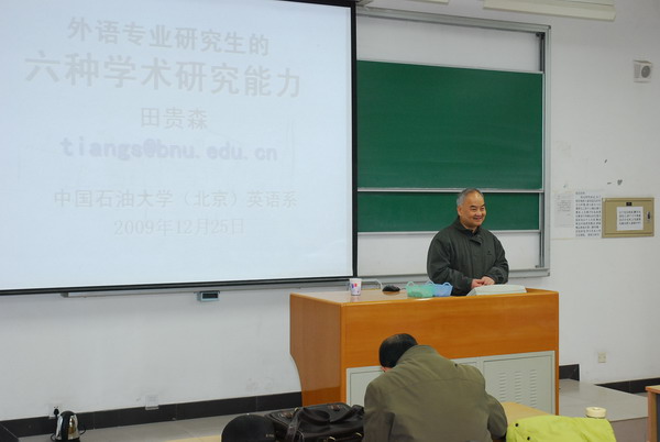 日前,应我校外语系邀请,北京师范大学田贵森教授为外语系师生做了题为“外语专业研究生的六种学术研究能力”的学术报告。报告在三教101举办,由赵秀凤教授主持。外语系老师以及全体研09学生听取了报告,并与田教授进行了交流。田教授从理论和实践两个方面阐述了学术研究能力的定义,以及外语专业研究生的六种学术研究能力,即:选择研究课题的能力,文献检索能力,分析综述能力,研究创新的能力,语言表达能力,学术规范能力。田教授的讲座深入浅出,在广大师生中引起了强烈反响,受到广泛好评。
