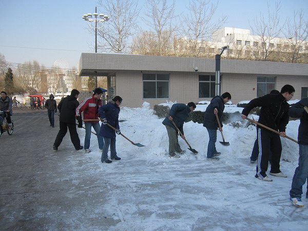 此次活动主要分三个方位同时进行扫雪,即科研楼东侧的停车场、中心停车场与三教东侧的停车场。大家热情高涨,积极参与铲雪活动。30把铁锨、84颗火热的心,在午后的停车场舞动起来。有用铁楸铲的、有用扫把扫的、有用长锹堆的,老师及同学们用自己的热情在挥撒着一份份爱心。更让人感动的是,有不少自发的人群也积极加入扫雪的队伍中来。一位素不相识的留学生,了解情况后,二话没说就挽起袖子开始进行扫雪。经过近三个小时的奋战,南校区停车场上的积雪基本上被清扫完毕。