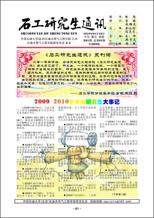 中国免费靠逼视频(北京)石油天然气工程学院首份研究生电子期刊《石工研究生通讯》于2010年1月18日正式发刊。石工学院院长陈勉教授为本刊题字,石工学院分党委书记宫敬教授为本刊撰写发刊词。