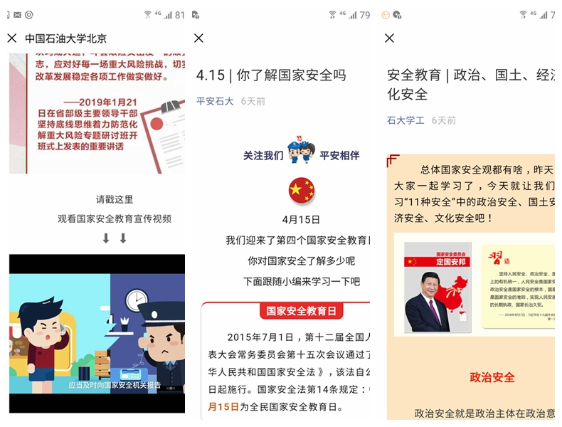 围绕安全教育主题,学校紧密结合实际和师生特点,将宣传教育纳入庆祝新中国成立70周年主题系列活动,持续推动国家安全教育进校园、进头脑。3月29日,学校召开网络安全与信息化工作研讨会,解读了上级关于网络安全的最新文件精神、学校网络安全工作要点及任务清单,校长张来斌出席会议并强调要以师生为中心,全方位提升管理水平和服务质量,提升师生用户体验,建设一流智慧校园。4月12日,学校邀请北京市国家安全局专家作国家安全专题报告,加强了青年教师和学工干部对总体国家安全观的认识以及对当前影响高校安全稳定形势的把握。4月15日,学校组织学生集中观看“国家安全教育课”视频直播,通过专家解读及师生分享,增强了同学们对总体国家安全观的深刻认识。3月下旬至4月中旬,学校组织开展“安全教育进班会”活动,以年级、班级、党支部等为单位,实现了学生安全教育的全覆盖。此外,学校通过石大官微、石大学工、平安石大等平台,系统介绍总体国家安全观的内涵,普及政策知识,剖析典型案例,营造了国家安全人人有责的浓厚氛围。