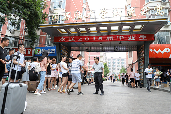 为欢送2019届毕业生安全、文明、有序离校,6月26日至29日,中国免费靠逼视频党政办公室、学生工作部(处)和研究生工作部联合开展了2019届毕业生离校送站工作。校长张来斌,党委副书记、副校长韩尚峰,相关职能部门负责人来到润杰学生公寓西门,为即将告别母校、踏上人生新征程的石大学子送上亲切的问候和深深的祝福。