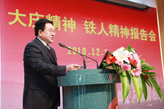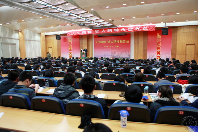 英雄风范塞沧溟,一代铁人石油魂;铮铮铁骨昭青史,国强莫忘开拓人。报告会上,大庆精神、铁人精神宣讲员苏爱华、何德全,用满怀深情的语言,图文并茂地描述了大庆油田艰苦卓绝、波澜壮阔的石油大会战,详细介绍了在石油大会战的大熔炉里形成的一整套大庆优良传统和优良作风,再现了中国石油工人的光辉典范王进喜从一名普通钻工成长为全国闻名的铁人、铸就石油之魂的人生历程,深刻阐释了大庆精神、铁人精神的形成过程和丰富内涵,揭示了大庆精神、铁人精神对几代艰苦奋斗、甘于奉献的石油人的引领和激励作用。生动的报告感人至深,催人奋进,现场许多同学留下了感动的泪水。