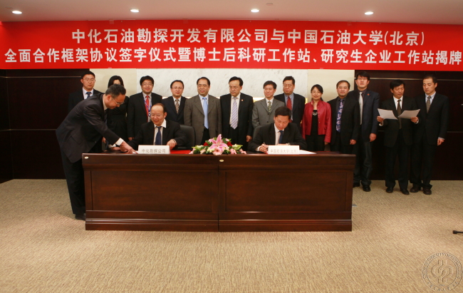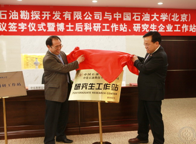 张士诚与赖豪魁分别代表学校与公司签订战略合作框架协议和研究生工作站协议。李丕龙与张来斌一起为“中化石油勘探开发有限公司博士后科研工作站”、“中化石油勘探开发有限公司研究生企业工作站”揭牌。