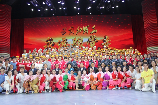 演出结束后,校党委书记蒋庆哲与石大参演团队合影留念