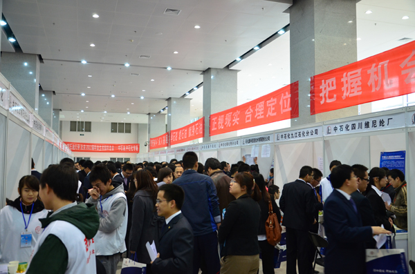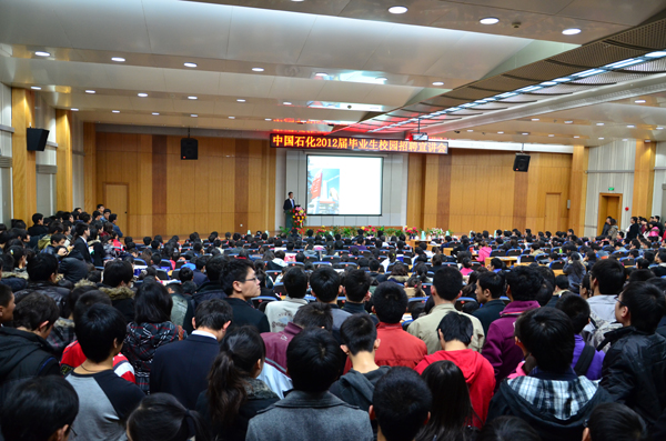 在双选会前,中国石油化工集团公司于11月15日在翠宫报告厅进行了2012届毕业生校园招聘宣讲会,培训开发处主管杨俊介绍了中国石化2012年度招聘情况,胜利油田、江苏油田、石油工程技术研究院、石油物探研究院、天津石化等五家单位作为中国石化企业代表分别进行了本单位的招聘宣讲。