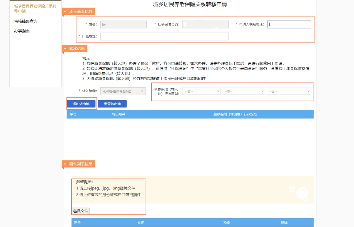 ①原个人编号;②户籍所在地;③原参保地所在地区名称;④原参保地社保机构行政区划代码;⑤原参保地社保经办机构;⑥原参保地社保机构联系电话;⑦原参保地社保机构联系人;⑧原参保地社保机构地址;⑨原参保地社会机构邮政编码。