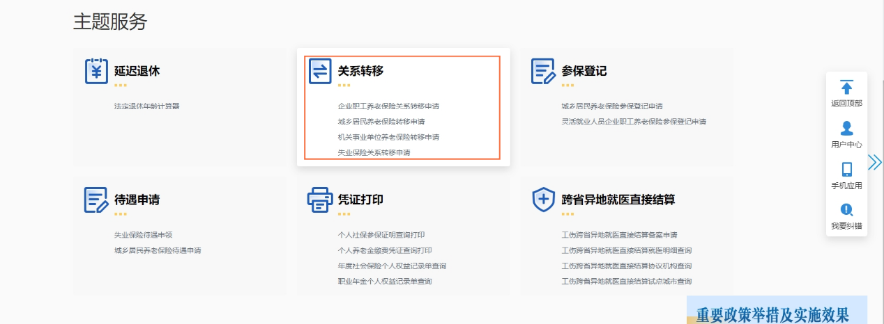 2. 在“人社办事”模块下,找到“社会保障”,选择“养老保险”下的“养老保险关系转移”。
