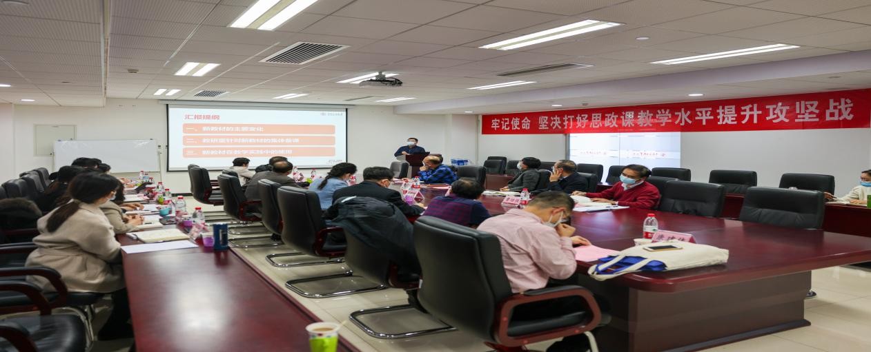 会议由马克思主义学院院长张明明主持。马克思主义学院科研副院长庞昌伟、教学副院长吴建伟分别就团队建设和运行规划等情况进行汇报,各教学团队负责人则分别针对四门思政课“讲好用好2021版新教材”进行说课。