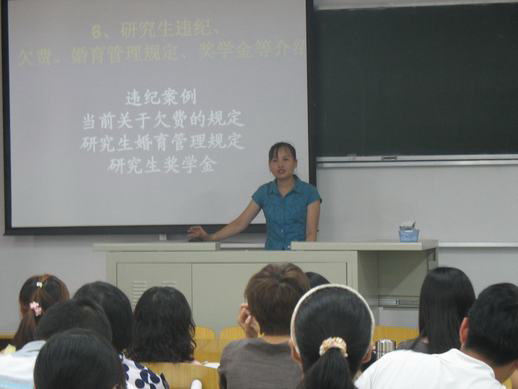 肖中琼首先欢迎2009级的38名硕士研究生到校学习,结合学校、人文社科部研究生教育现状对同学们提出新的希望。同时,肖书记运用丰富翔实的资料向2009级研究生介绍了学校和人文社科部的历史、定位及发展,并着重从大学生文明道德、安全教育等等7个大方面进行了教育,并结合实例对新生提出要求和希望,希望大家迅速完成从本科生或职场人士到研究生的角色转换。