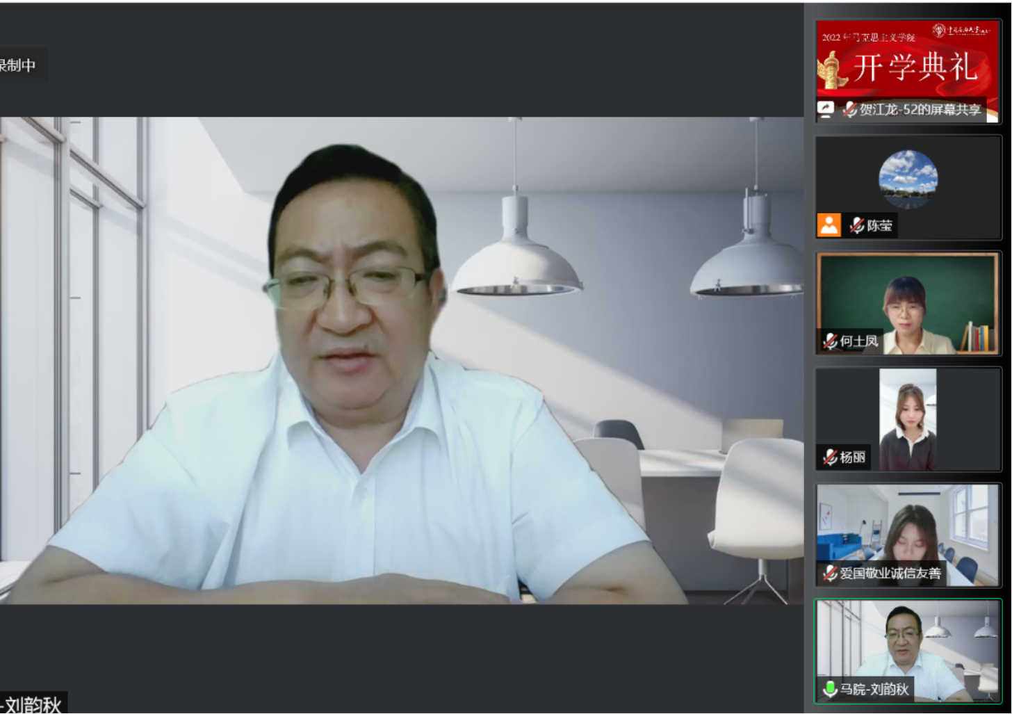 2022年8月22日下午,马克思主义学院召开2022级新生开学典礼。院领导刘韵秋、张明明、吴建伟,2022级班主任、辅导员和2022级全体新生通过线上方式参加典礼。教师何土凤主持开学典礼。
