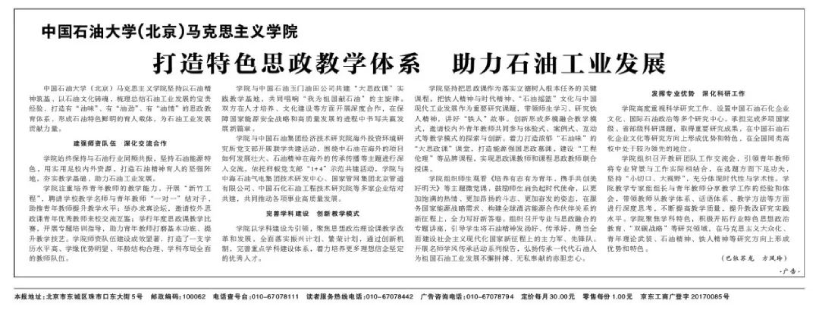 在习近平总书记发表“3·18”座谈会重要讲话五周年之际,光明日报刊发了介绍中国免费靠逼视频(北京)马克思主义学院打造特色思政教学体系、助力石油工业发展的相关报道。
